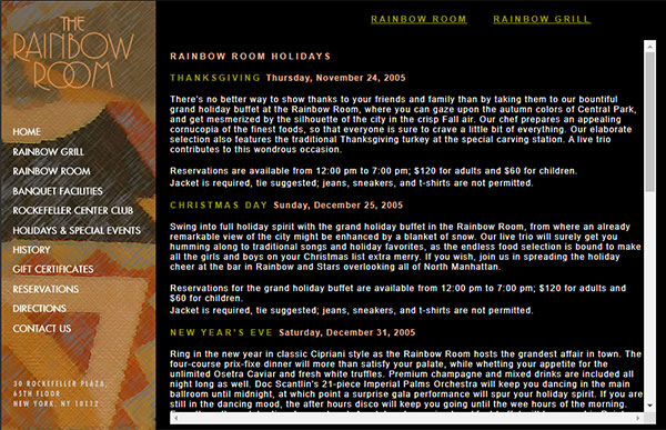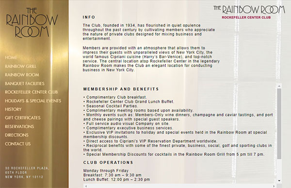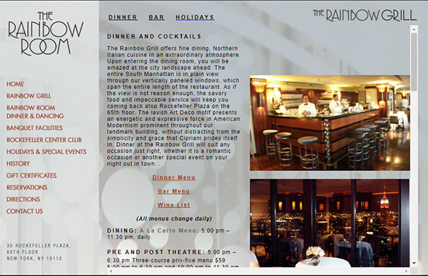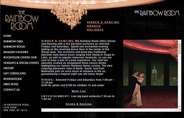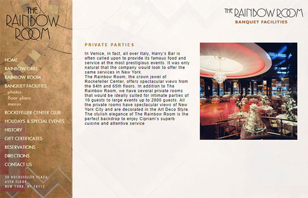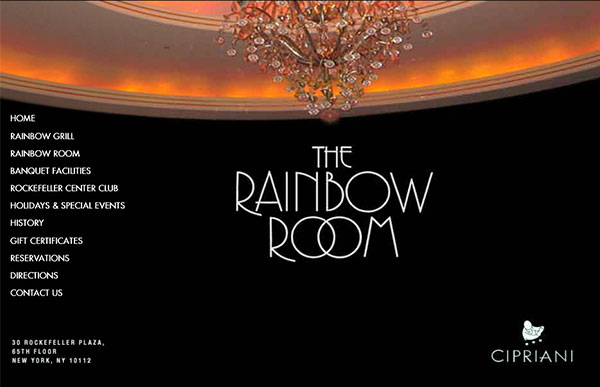 I had the privilege of going to the Rainbow Room, taking photos of the rooms and then incorporating those photos into the design. The Rainbow Room Website Logo was a combination of working with a font that they liked and a photo that I took of the ballroom at 30 Rockefeller Center. This website was live for many years.